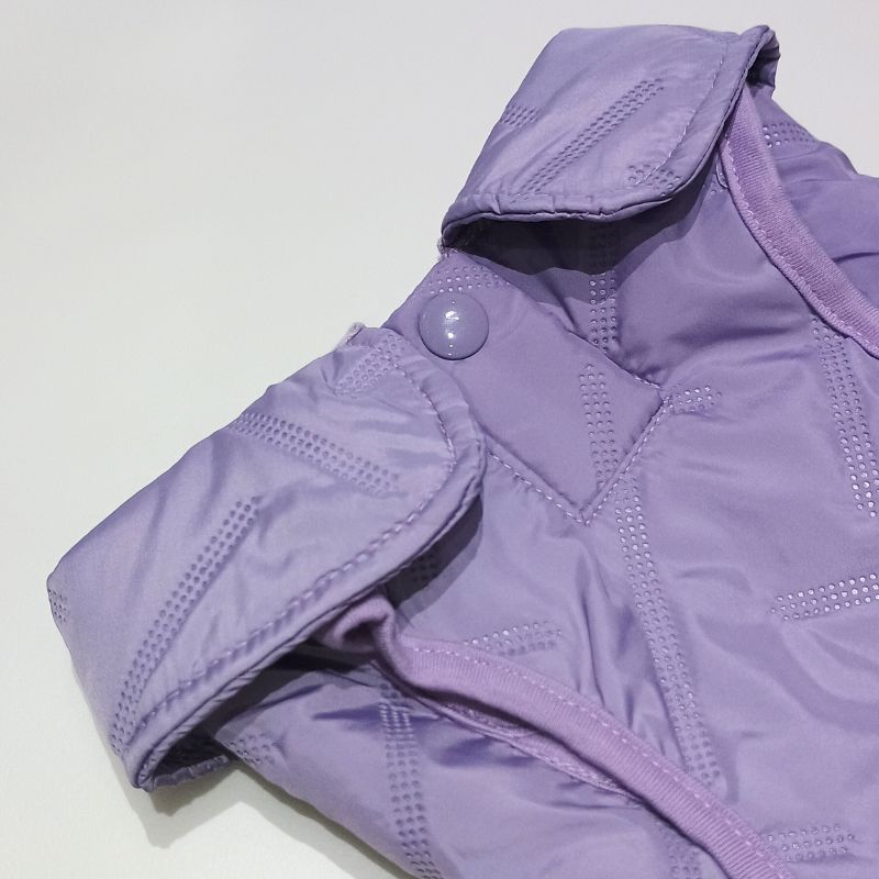 Es de tela impermeable ligera, con forro interno de 100% algodón y velcro para ajustar y cerrar. Cuenta con un agujero para pasar la correa y que se pueda usar la pechera por dentro.