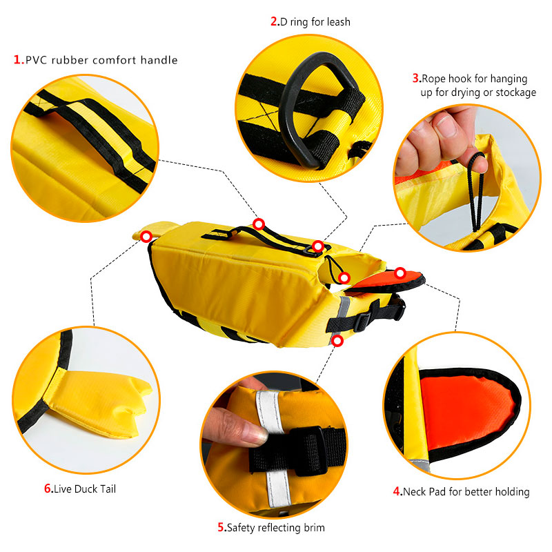 Nuestro chaleco salvavidas cuenta con una argolla por si deseas colocar la correa, un mango cómodo para sujetar, 2 rayas reflectivas de seguridad, una almohadilla para una mejor fijación del cuello y ganchos de seguridad para un mejor ajuste del pecho y cuello.