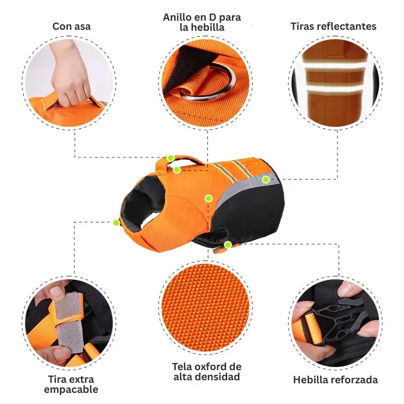 Si eres de los que lleva a su peludito a todos lados, entonces no hay manera que se pierda de las vacaciones de verano. Si le encanta nadar o está aprendiendo, no se puede dejar de lado la seguridad. Cuenta con una argolla por si deseas colocar la correa, un mango cómodo para sujetar y rayas reflectivas de seguridad.
