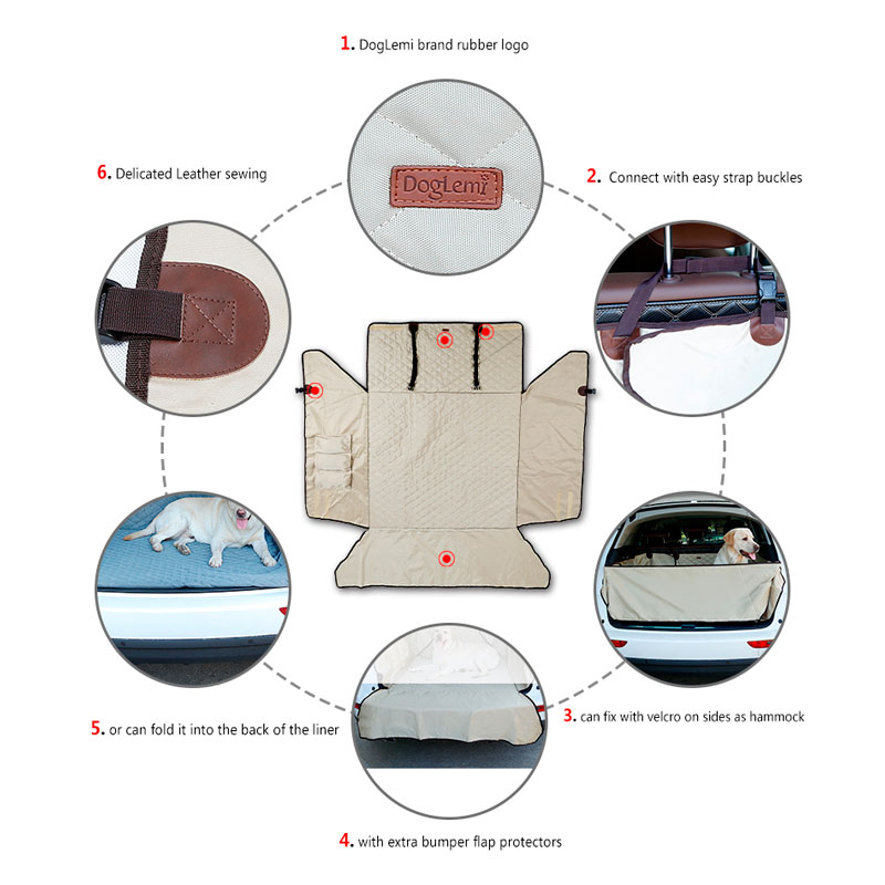 Posee correas para sujetar el cobertor a los asientos posteriores del auto. La base se sujeta al automóvil con unas líneas de velcro y tiene una extensión que sobresale de la parte inferior que brinda una protección extra, la cual puedes doblar en caso no la necesites. Además, incluye cierres con velcro para transformar el cobertor a una hamaca y bolsillos para guardar botellas o artículos para tu mascota. El cobertor se puede doblar, guardar y transportar fácilmente en su maletín.