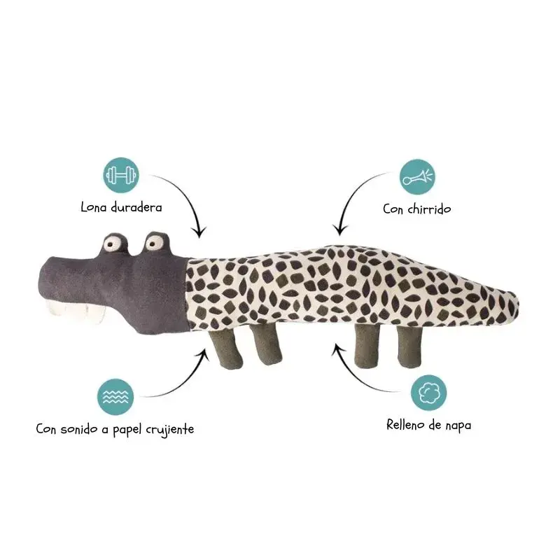 Nuestro juguete para perros “Croc My World” cuenta con lona de algodón duradera, un chirriador muy fuerte, papel arrugado y está impreso con tinta a base de agua y no tóxica, fue diseñado teniendo en cuenta el juego interactivo y un aspecto que complementa la decoración del hogar moderno. Ya sea que lo hagas chirriar, arrugar o lanzar, este juguete hará que la hora de jugar sea una gran diversión para los cocodrilos.