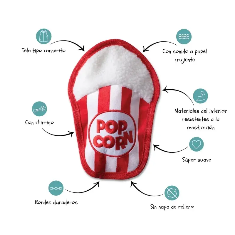 ¡Noche de películas! Nuestro juguete de peluche duradero “What’s Poppin’?” fue diseñado teniendo en cuenta el tiempo de juego prolongado, utilizando materiales interiores resistentes a las mordidas, encuadernación extraduradera, papel arrugado loco y un chirriador súper fuerte. Además, ¡no tiene relleno, lo que lo convierte en una cita de juego sin complicaciones! Tu cachorro estará de acuerdo, es hora de hacer palomitas de maíz y relajarse.