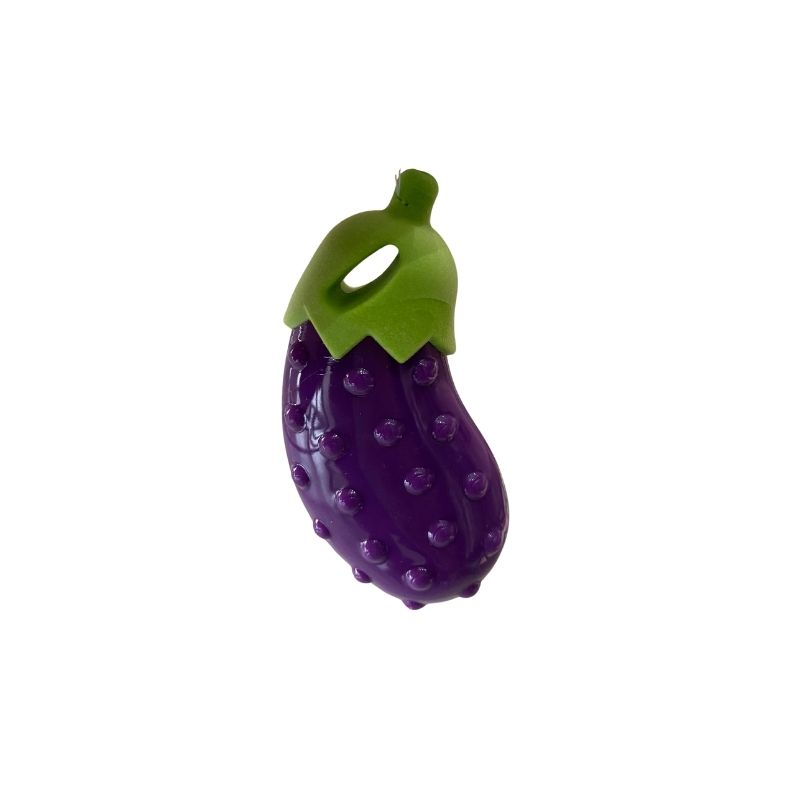 Juguete en forma de berenjena. Cuenta con un divertido chirriante para que tu mascota de divierta muchísimo jugando con él.