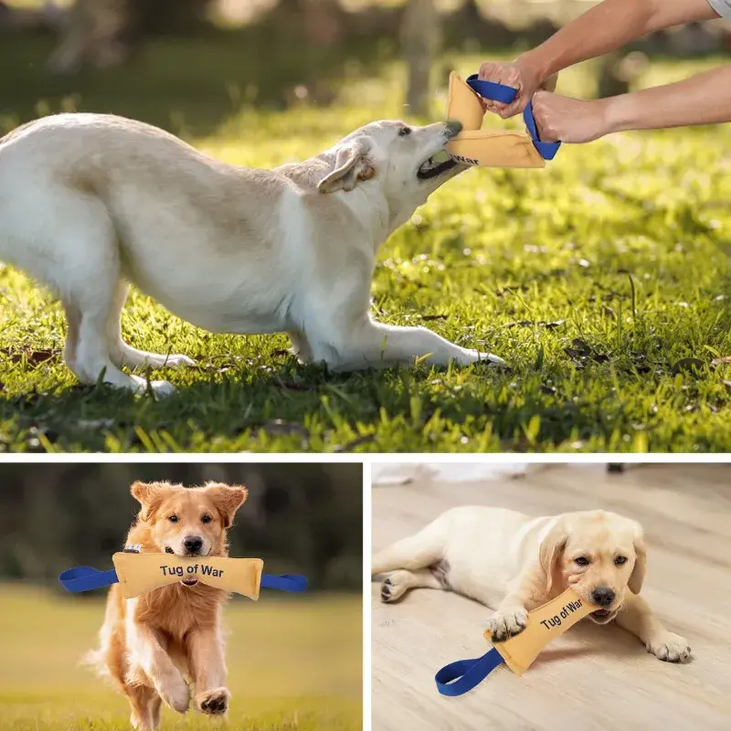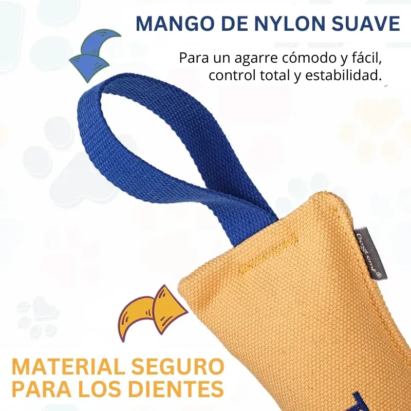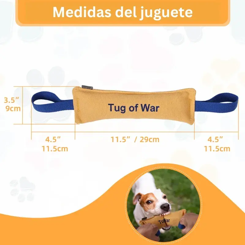 Puede usarse para los juegos de lanzar y atrapar, pero sobre todo para que tu canhijo pueda jalar. Solo asegúrate que muerda la parte acolchada, ya que las asas azules solo están destinadas para sostener el juguete mientras tu perrito está jalando.
