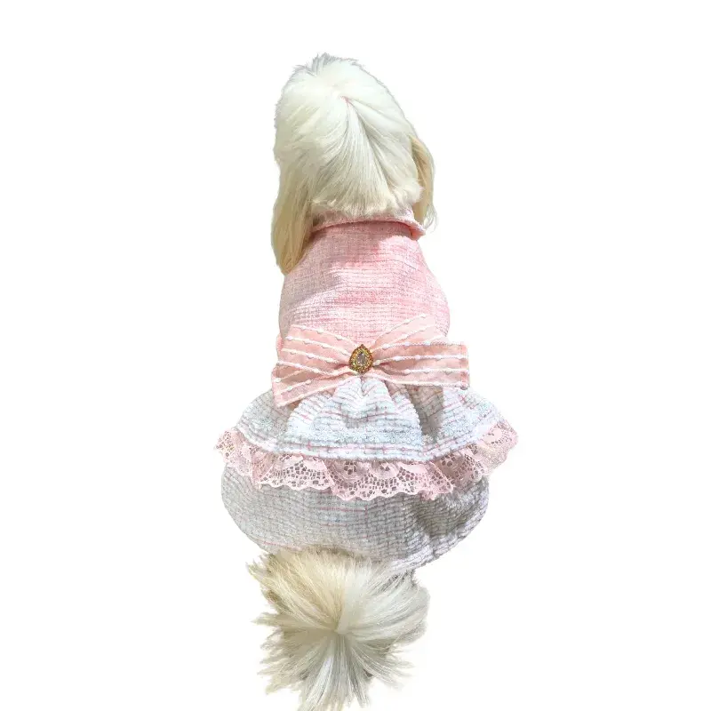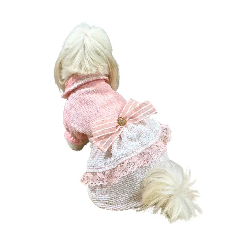 Un tierno color melón y de tejido suave delicado para la mayor comodidad de tu peludita. Hecho para ocasiones especiales o simplemente para hacer cualquier momento especial. Tiene bordados en tela y algunos con diseños de flores para hacerlo aún más elegante. Lo complementa un hermoso lazo decorativo en la cintura y una piedra en combinación para darle ese plus de glamour y ternura.