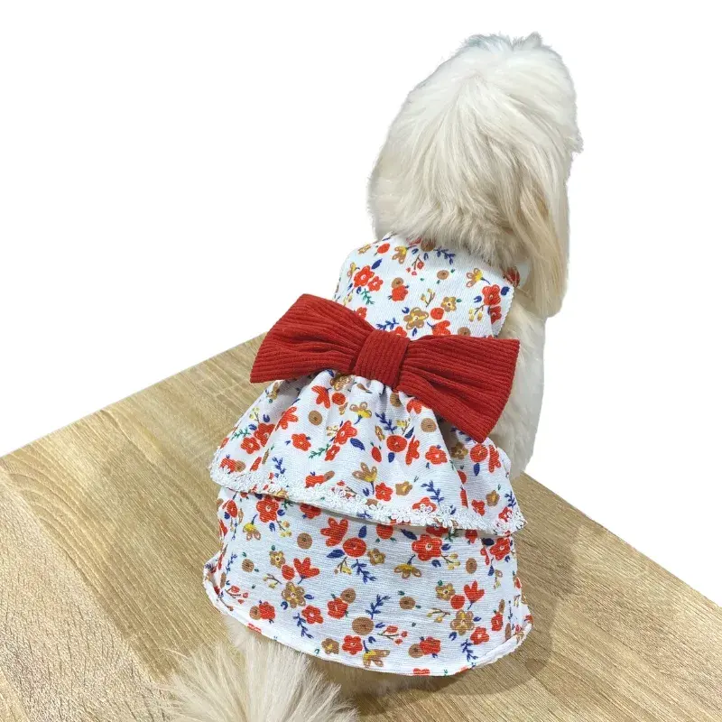 En un hermoso color perla y adornado por un estampado floral en tonos terracotas, ¡los colores tendencia de este año! Y si ves más de cerca, te enamorarás aún más de los detalles. Cuenta con un delicado bordado blanco, con formas de flores, lo que le da un toque más tierno y único. Y no podía faltar el gran protagonista, un elegante moño en la cintura, también en tono terracota.