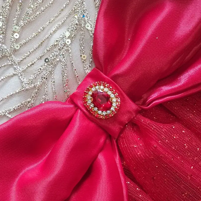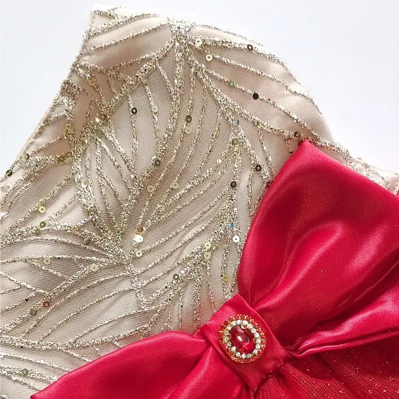 Perfecto para celebrar su cumpleaños, para un eventos especial en casa o para festividades únicas en el año. Un hermoso encaje en perla y detalles dorados, tutú rojo con brillos y un hermoso listón con pedrería en combinación.