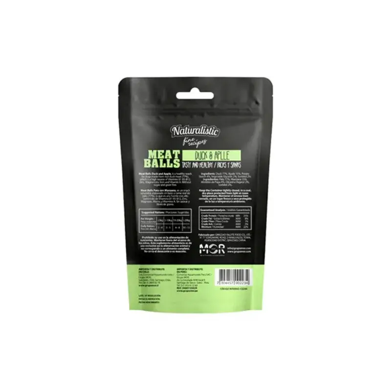 Consiente a tu perro con un snack sabroso, saludable y elaborado con ingredientes de alta calidad. Las albóndigas Naturalistic Fine Recipes de pato y manzana están hechas con proteína de pato 100 % real, aportando un sabor irresistible y nutrientes esenciales para el bienestar de tu mascota.