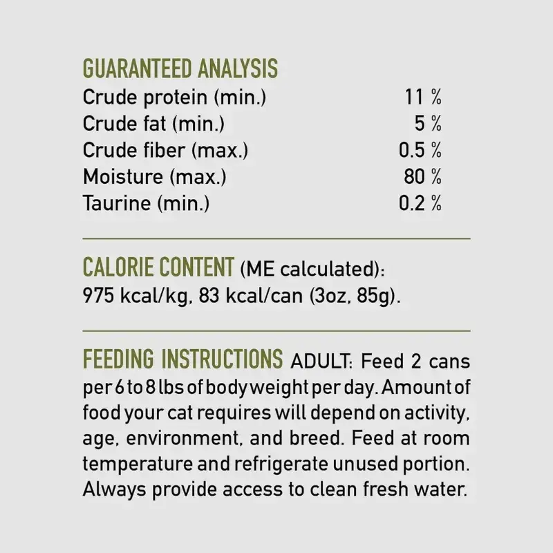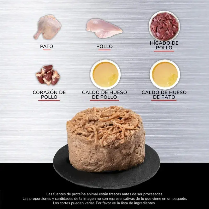 ¡Los primeros siete ingredientes de este alimento húmedo para gatos son pato crudo, pollo, hígado de pollo, corazón de pollo, caldo de huesos de pollo, caldo de hueso de pato y huevo! Este alimento premium para gatos también incluye un 80 % de humedad para mantener a tu gato nutrido e hidratado. ¡Como si se encontrara en la naturaleza!