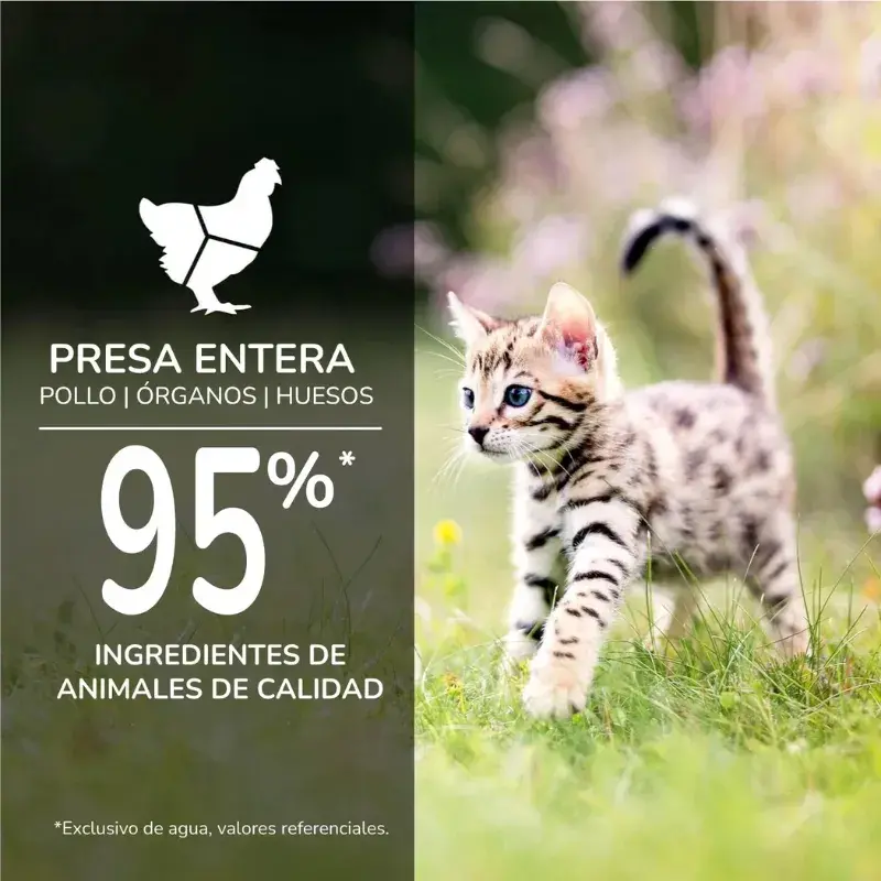 Está repleto de ingredientes animales de calidad del 95% y, lo mejor de todo, libre de guisantes, lentejas, legumbres, carragenina o encías. Esta comida húmeda con alto contenido de proteínas proporciona la nutrición que tu gato necesita para prosperar.