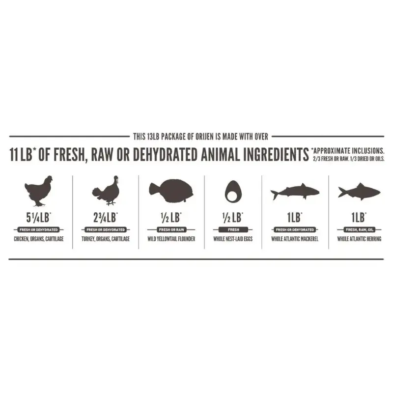 1/3 de las carnes son de pollo y pavo deshidratado (carnes frescas que se secan al ser expuestas a baja temperatura) para lograr una concentrada fuente de nutritiva proteína. 2/3 de las carnes son FRESCAS (refrigeradas, sin preservantes) o CRUDAS (ultra-congeladas, sin preservantes), incluyendo los 10 principales ingredientes de carne.