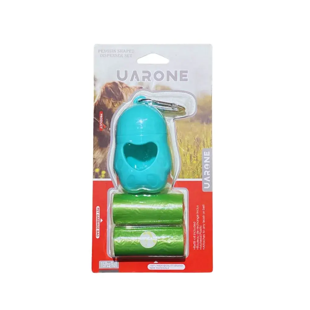 Práctico dispensador de bolsas para recoger desechos durante los paseos con tu mascota. Su diseño compacto permite llevarlo fácilmente sujeto a la correa o al cinturón. Incluye 2 rollos de bolsas resistentes y a prueba de fugas, con 15 unidades por rollo. Las bolsas están texturizadas para facilitar la apertura y la recogida. Fabricado con materiales duraderos y no tóxicos, es un accesorio funcional y económico para el uso diario en caminatas o viajes con perros de cualquier tamaño.