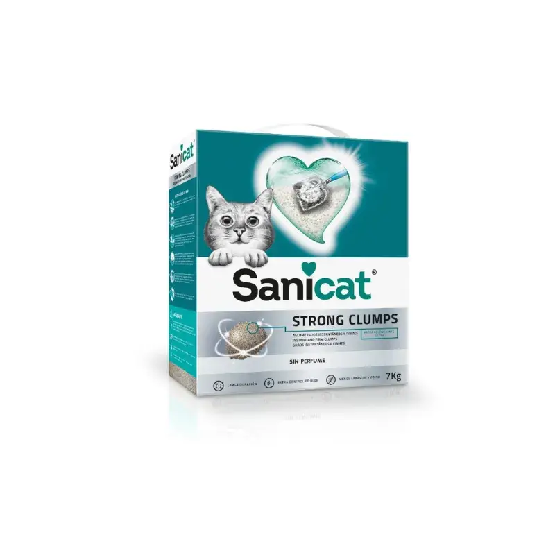 Arena aglomerante Sanicat Strong Clumps 7 kg para gatos, con aglomeración fuerte y control de olores prolongado, fácil de limpiar y de alta durabilidad.