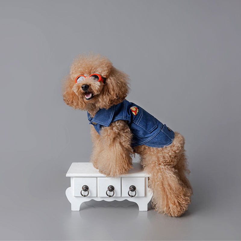 Lindo chaleco de jean con hebilla para que puedas enganchar su correa. Cuenta con un lindo estampado de Honguito (Toad) de Mario Bross.