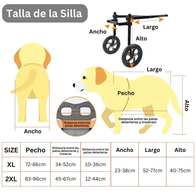 • Dirigido para perros que no cuentan con movilidad en sus patas traseras, ya que éstas deben de ir colgadas. De no ser así y aún tener movilidad, esto lo podría incomodar y por ello bajar las patas, lo que haría finalmente que la silla no le funcione.