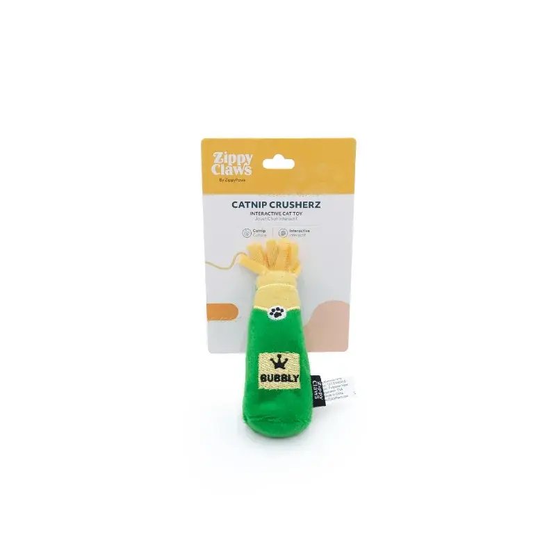 Los ZippyClaws Catnip Crusherz son pequeños y divertidos peluches que seguro que pondrán a prueba la diversión de tu gatito. En forma de botella de champaña y relleno de hierba gatera para despertar el interés de tu gato. ¡Lánzale un Catnip Crusherz a tu pequeño amigo bigotudo y observa cómo se convierte en el alma de la fiesta!