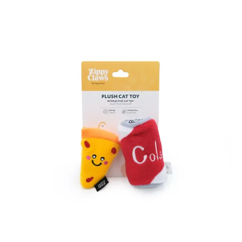 Este set de 2 incluye una rebanada de pizza crujiente y un refresco de cola con catnip.